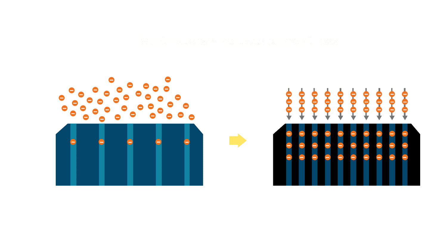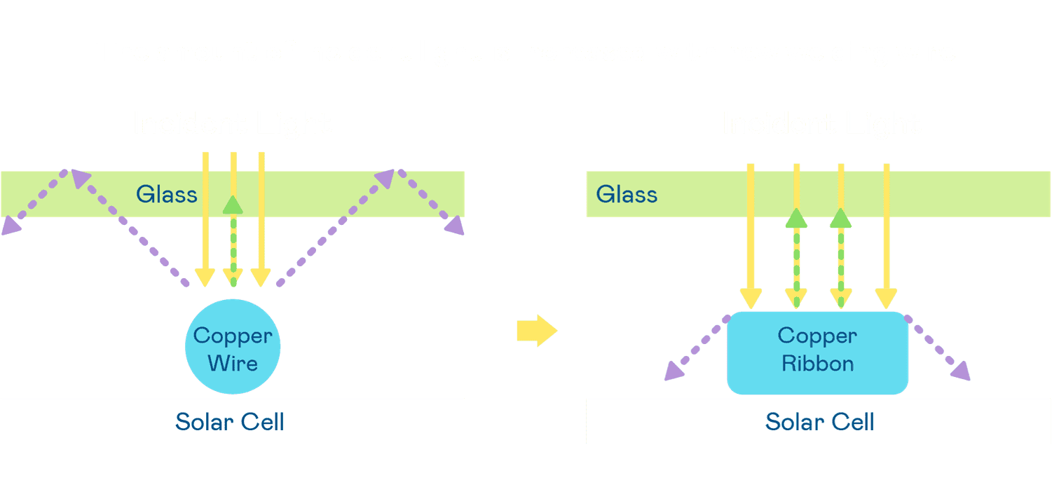 - 电池使用多条铜导线 (Copper wire) 于电池片上形成较短的电流路径,,,,提高电流收集效率,,,,采用圆形设计的铜导线较传统扁平式的铜焊带 (Ribbon),,,,可增加入射至电池的光线量。。