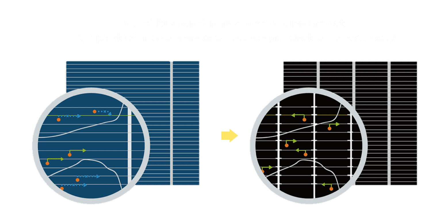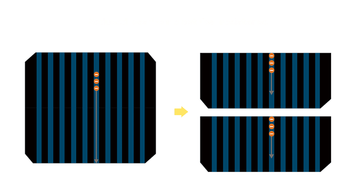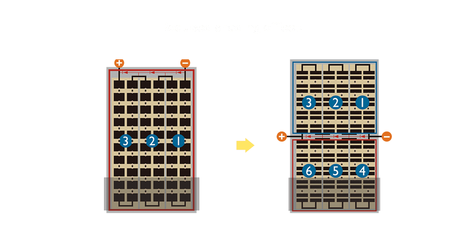 - 结合半切电池,,,,降低遮阴影响、、提升模组抗隐裂能力、、、、并减少电阻损耗,,,进一步提升模组发电效能。。。。