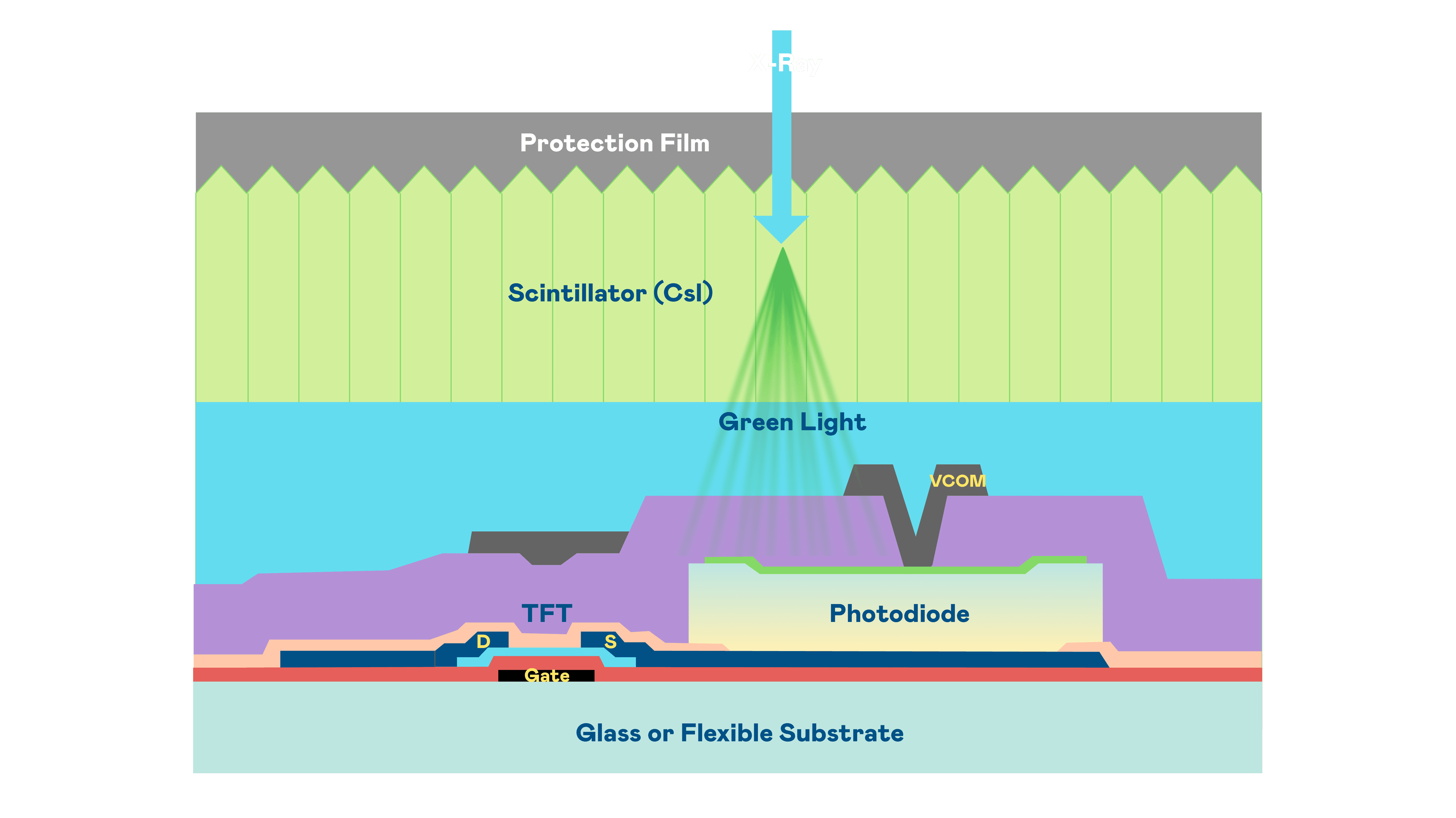 杏悦2的X光影像感测阵列使用薄膜电晶体 (TFT) 作为每个像素的读取开关,,搭配光电二极体(Photodiode)的光电转换元件,,,用以感测X光影像讯号。。
